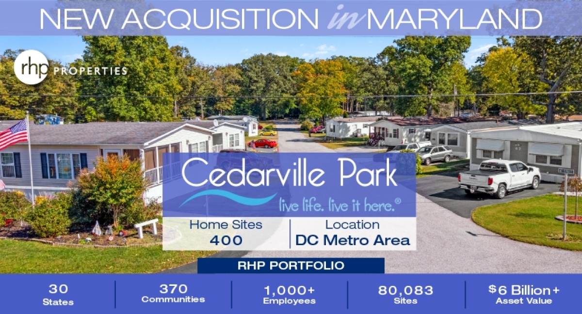 RHP Properties Announces Purchase of Cedarville Park Manufactured Home Community in Washington, DC Suburb with 400 Home Sites
